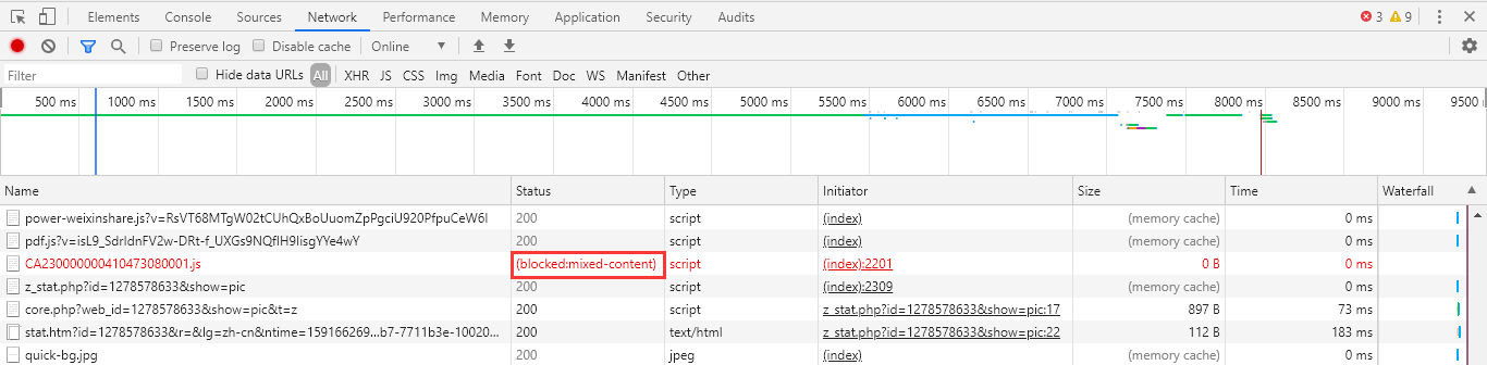 问题描述:调用第三方站点的JS,遇到请求被浏览器block(blocked:mixed-content)的情况,如图所示: