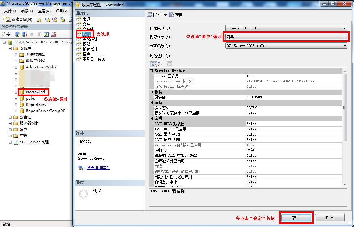 1.把数据库的恢复模式设置为“简单模式”,选择Northwind数据库-右键-属性,在弹出的数据库属性窗口中,选择“选项”-设置恢复模式为“简单”,点击确定按钮,如下图:
