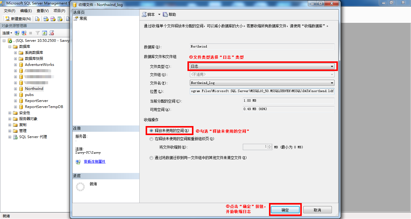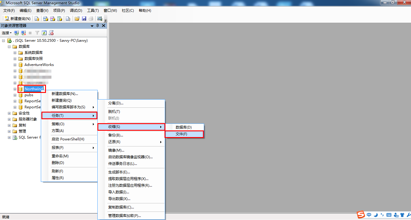 选择Northwind数据库-右键-任务-收缩-文件,如下图: