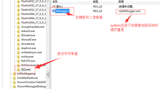 3、 新建QQ.exe【需要调试的进程名】, 右键修改字符串值,右键debugger修改二进制值-----vsjitdebugger.exe,如上图