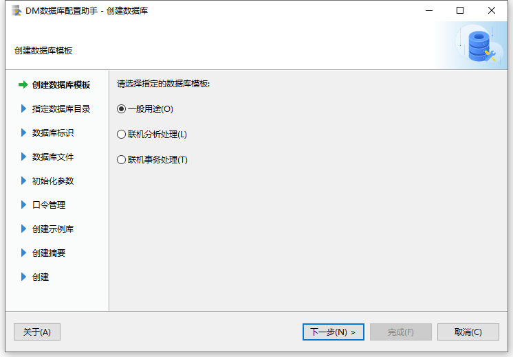 系统提供三套数据库模板供用户选择:一般用途、联机分析处理和联机事务处理,