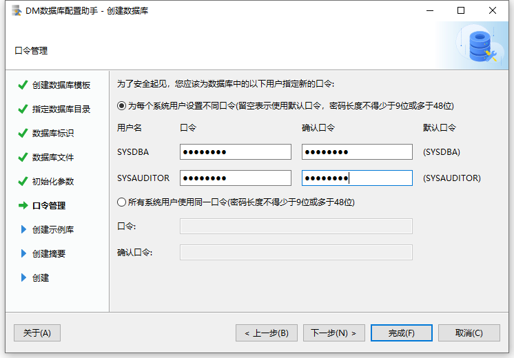 用户可输入 SYSDBA,SYSAUDITOR 的密码,对默认口令进行更改,如果安装版本