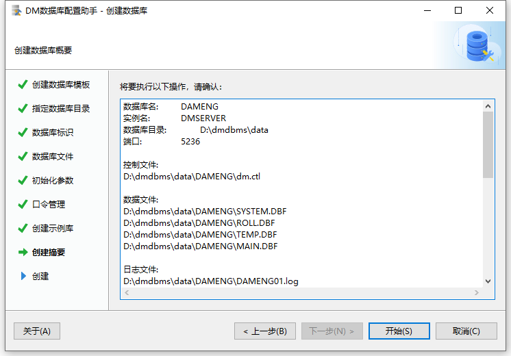 在安装数据库之前,将显示用户通过数据库配置工具设置的相关参数。如下图所示:
