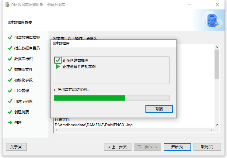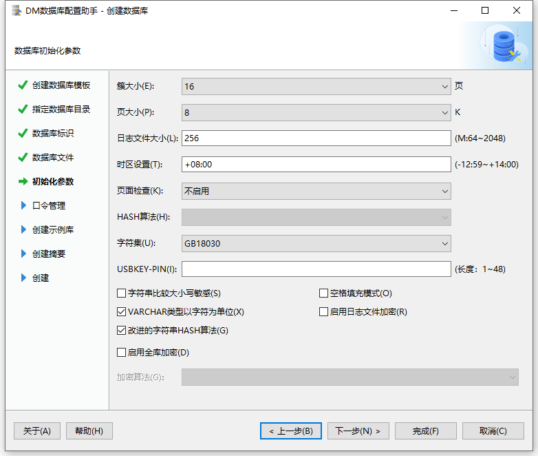 用户可输入数据库相关参数,如簇大小、页大小、日志文件大小、选择字符集、是
