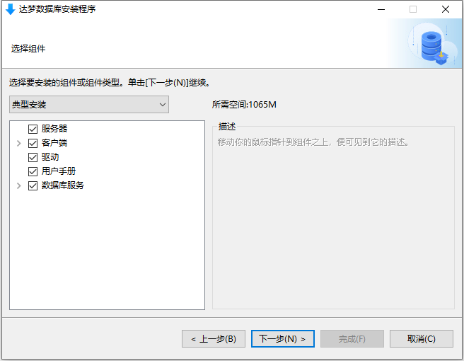典型安装包括:服务器、客户端、驱动、用户手册、数据库服务。