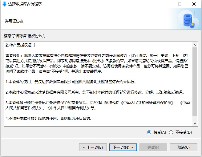 则选中“接受”,并点击“下一步”继续安装;用户若选中“不接受”,将无法进行安装。
