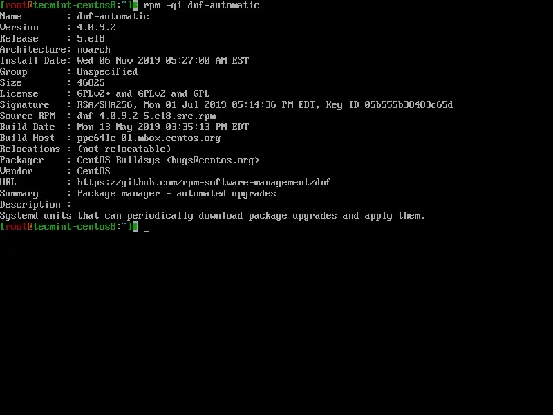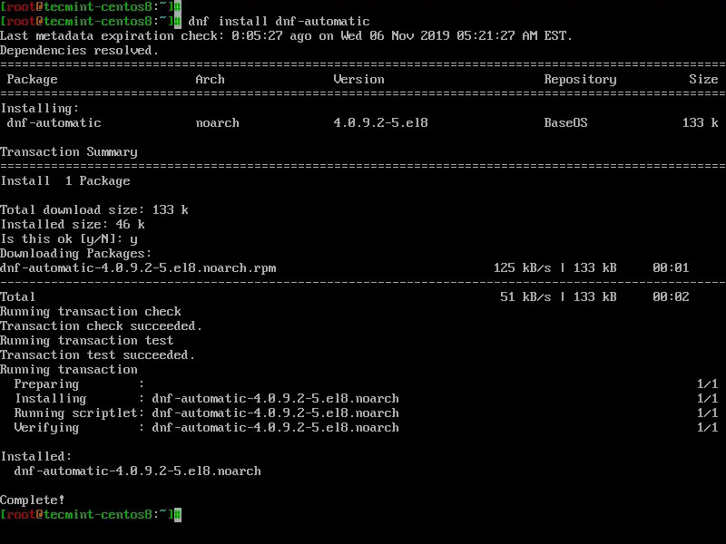 最后,你现在可以运行dnf-automatic,执行以下命令来调度CentOS 8计算机的DNF自动更新。
