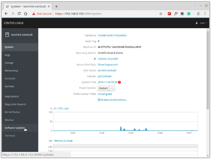 在CentOS 8上预先安装了Cockpit,它使系统管理员可以从基于Web的控制台管理任务。 你可以使用Cockpit来更新操作系统和软件。