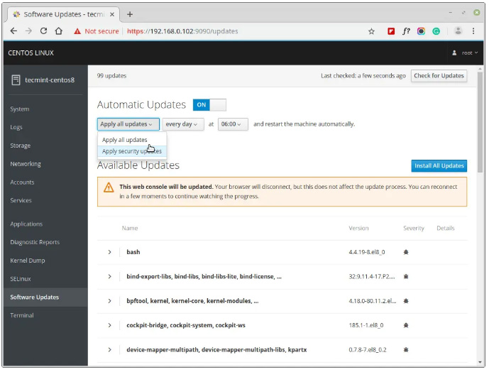 为此,请使用管理员账户通过 https://SERVER_IP:9090 (其中SERVER_IP是CentOS 8服务器的IP地址)登录到Cockpit 。登录后,单击左侧导航栏中的软件更新。