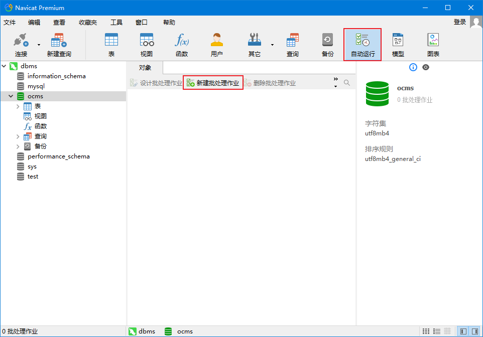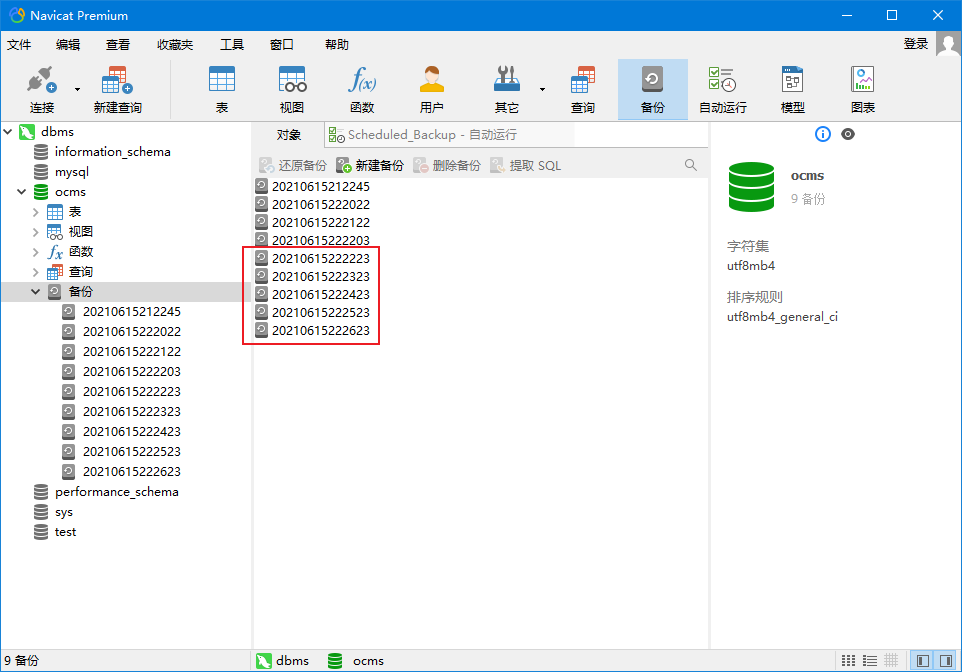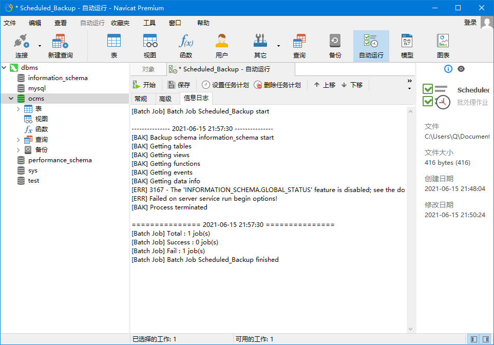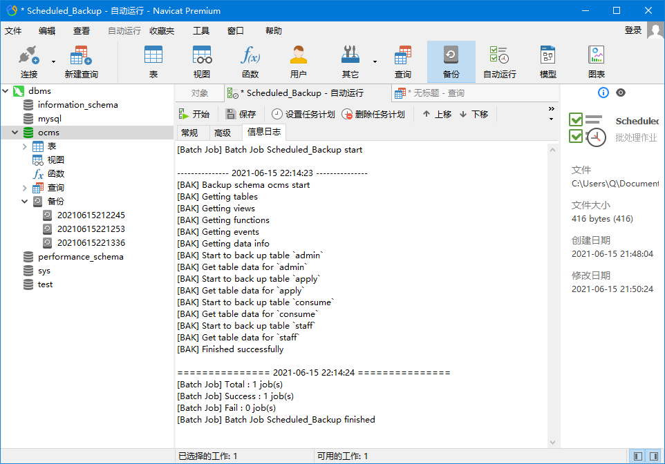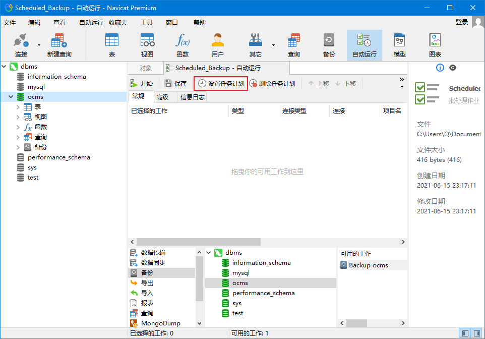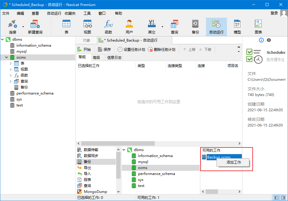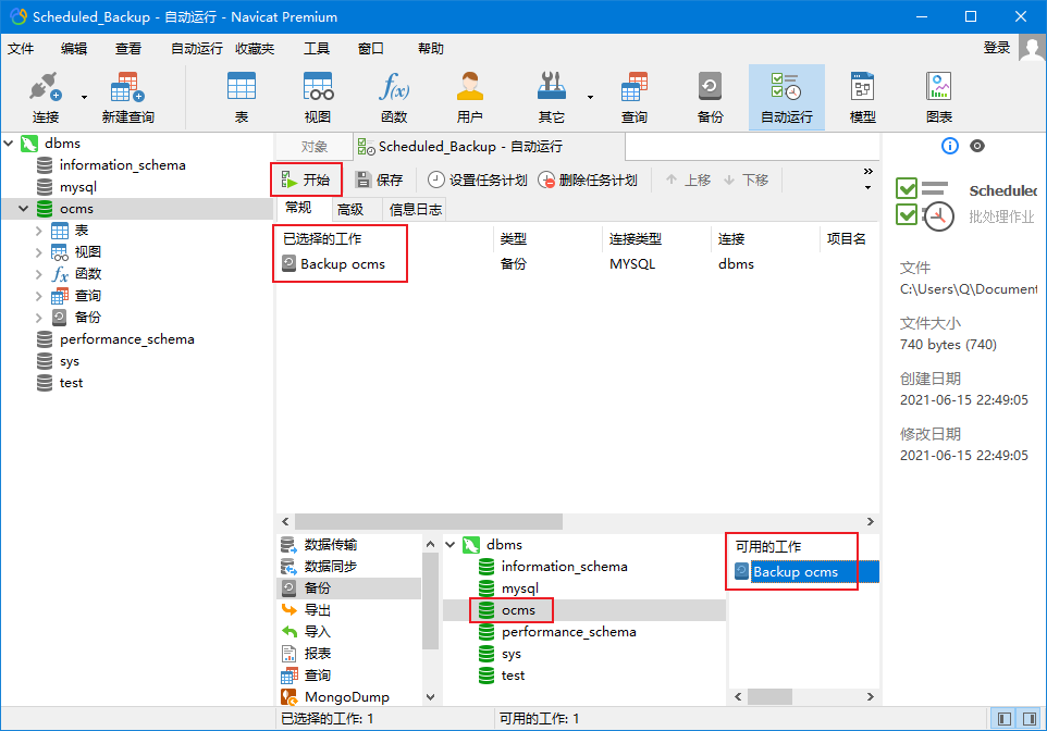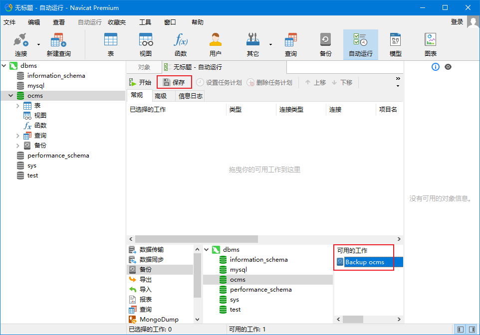 - 点击 备份 -> 选择数据库 -> 选择可用的工作,点击保存