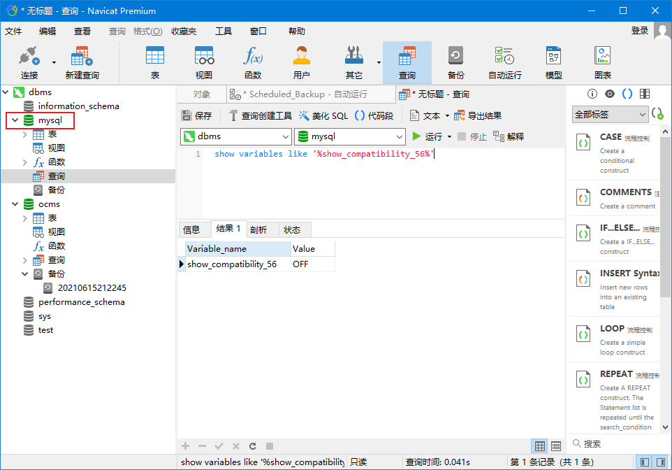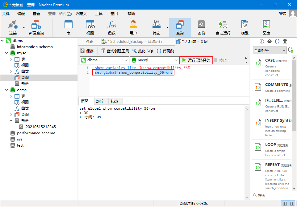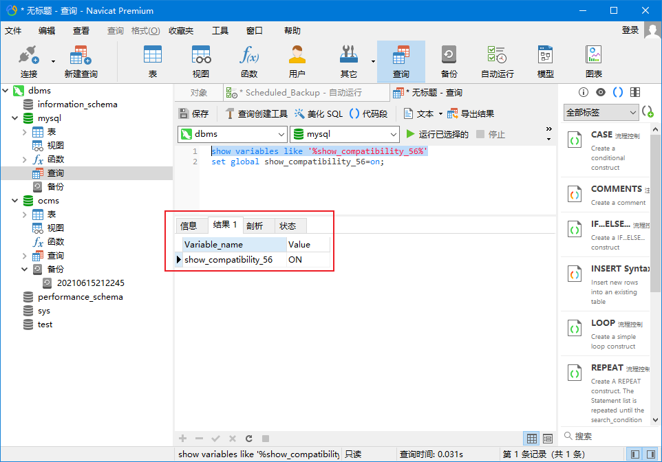 show variables like '%show_compatibility_56%'set global show_compatibility_56=on;