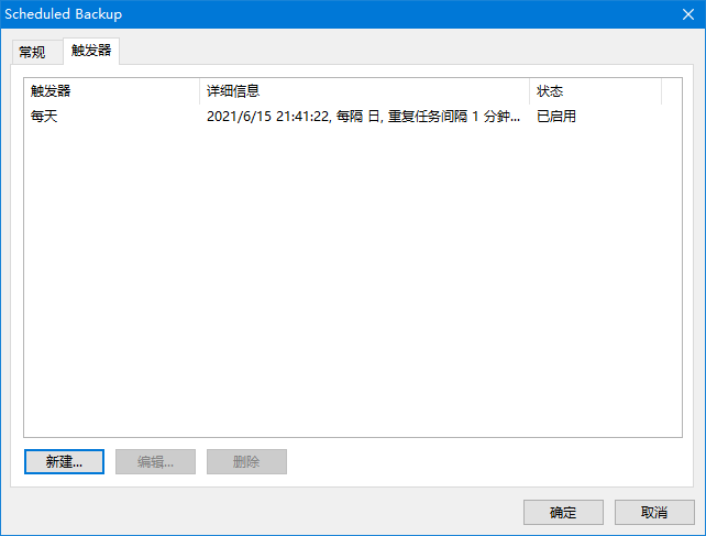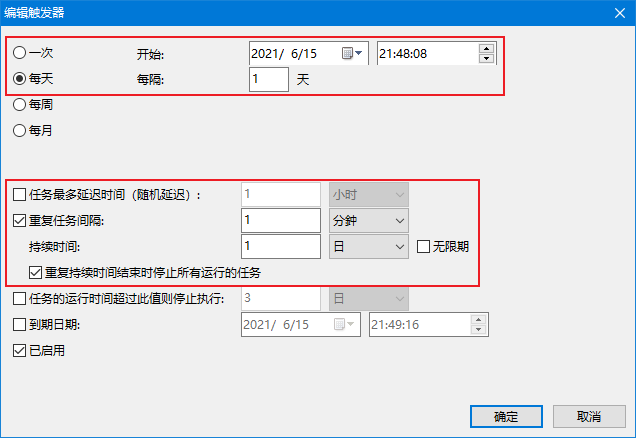 每天进行备份,从当前时间开始执行,重复任务间隔 1min,持续时间 1d,重复持续时间结束时停止所有运行的任务