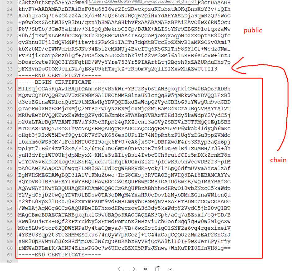 将crt证书上传,重新获取证书链,然后将文本复制到原来的crt证书中即可