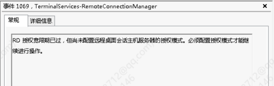 查看事件管理器,报错如下:RD授权宽限期已过,但尚未配置远程桌面会话主机服务器的授权模式。