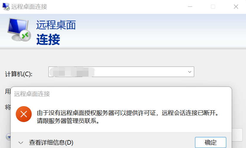 问题描述:由于没有远程桌面授权服务器可以提供许可证,远程会话连接已断开。