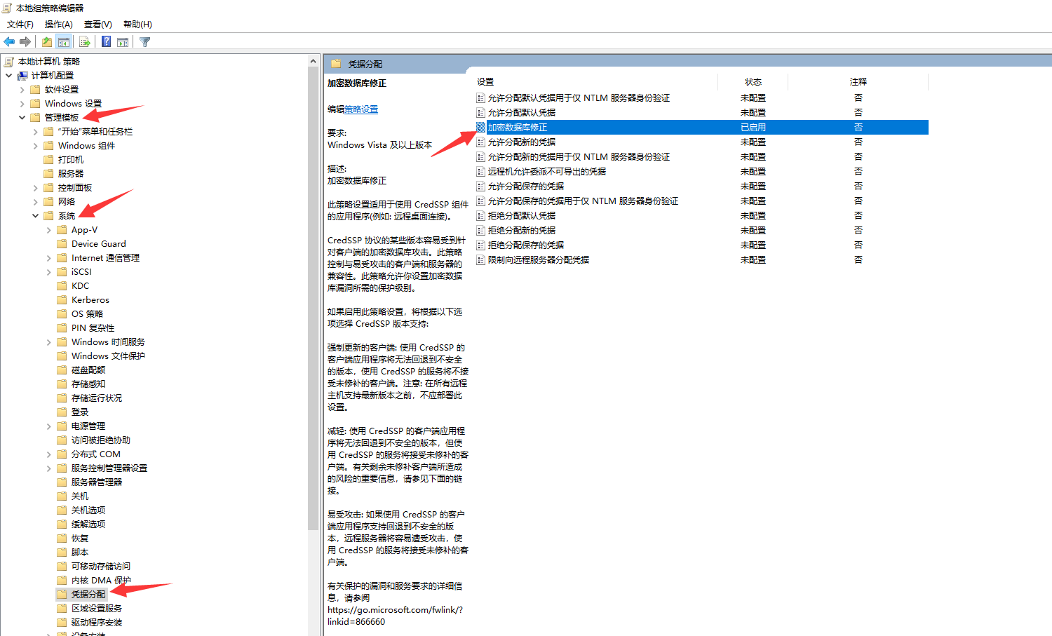 计算机设置->管理模板->系统->凭据分配->加密数据库修正
