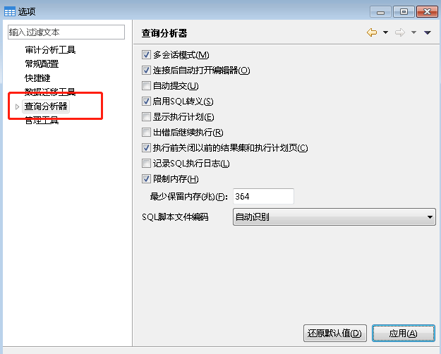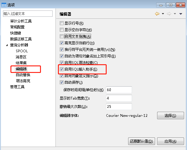 2,选择编辑器,然后在右边区域,勾上启用SQL输入助手,应用即可,如下图