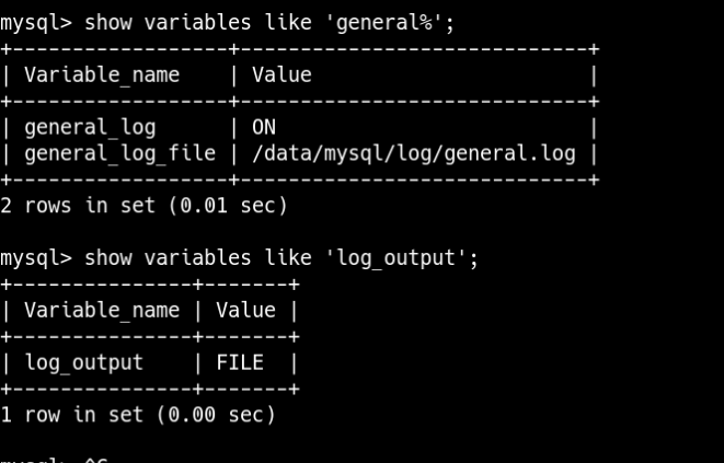 show variables like 'log_output'; -- 看看日志输出类型 table或file
