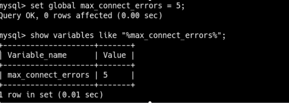 1.show variables like "%max_connect_errors%"; 查看限制最大错误连接次数,默认值为100