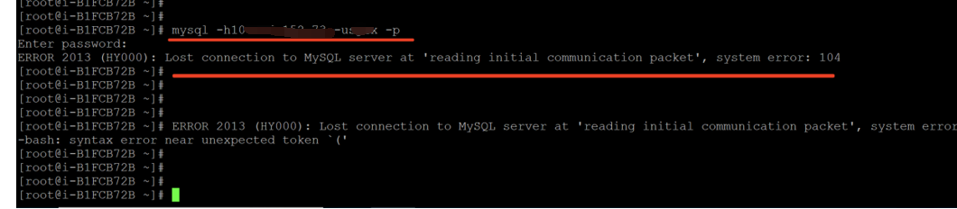 报错摘要:ERROR 2013 (HY000): Lost connection to MySQL server at 'reading initial communication packet', system error: 104,如下图: