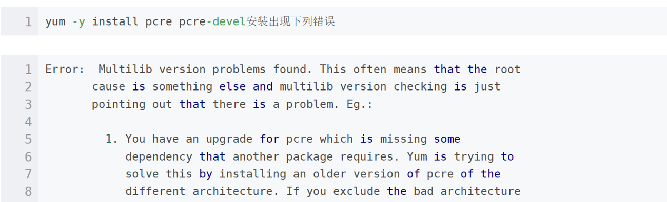 问题分析:安装Nginx必要组件提示yum -y install pcre pcre-devel安装出错,如下图: