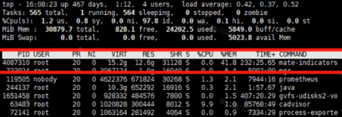 发现mate-indicators进程占用内存资源达到节点总内存40%,导致服务出现内存熔断