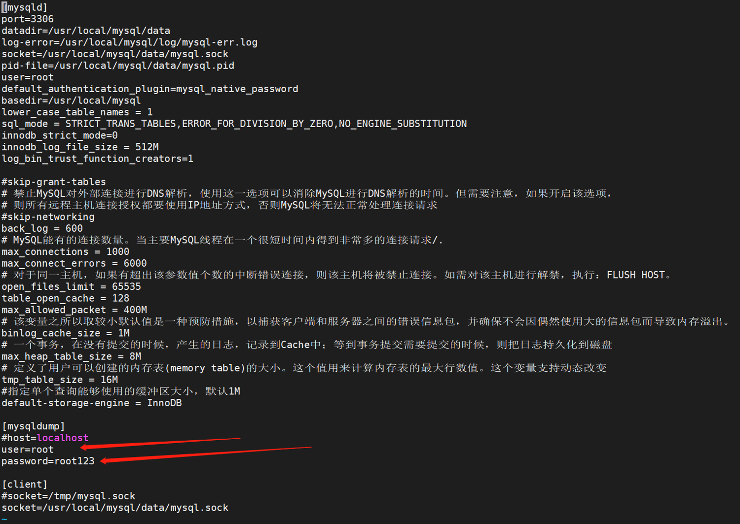 vi /etc/my.cnf,给[mysqldump]功能模块添加上用户名和密码