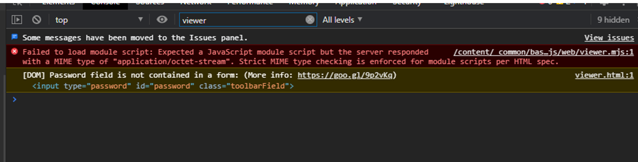 问题分析:wf系统自带的pdf播放器提示mjs文件加载失败,如下图: