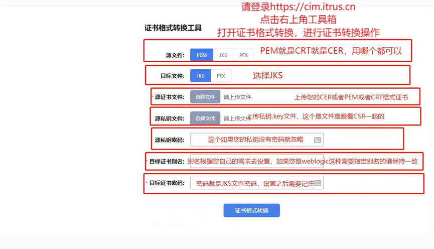 问题描述:只有pem和key 格式的文件,需要转换位pfx文件问题处理:登录https://cim.itrus.cn ,使用格式证书转换工具进行转换