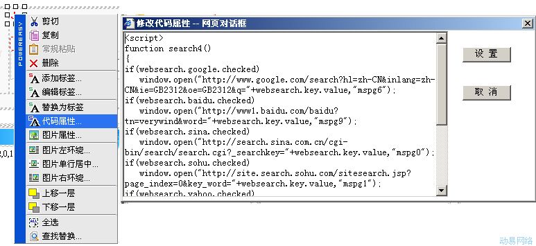 如果在内容编辑区中插入了JS代码,则可以看到图标。选中JS代码后单击右键,在出现的右键菜单中选择“代码属性”,出现“修改代码属性”设置窗口: