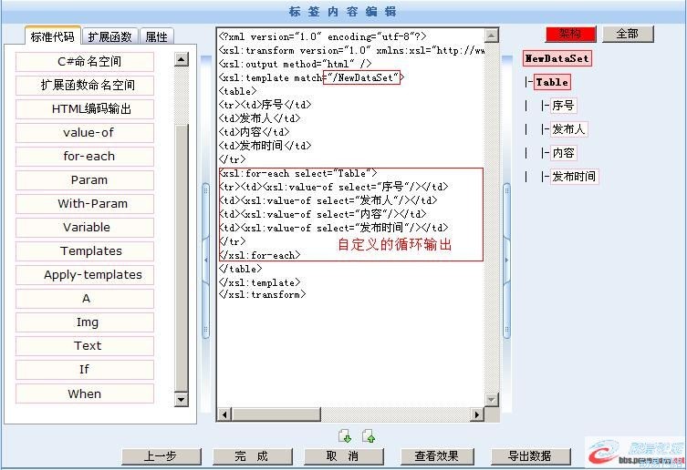最后的标签模板编辑,也与上次教程基本一致,请注意本次不一样的地方我已经用红框标出,这是为了输出表格时,只循环该循环的代码而进行的改变。