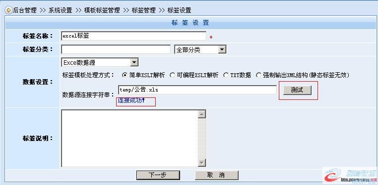 这个文件编辑好以后,把它放到网站的Temp目录下,这个例子里文件名为"公告.xsl"。然后重新建立一个标签(设置如下图)。特别要注意的是,数据源连接字串就是你存放EXCEL文件的位置,设置好后必须点击"测试"按钮,如果显示"连接成功!"才可以进行下一步。