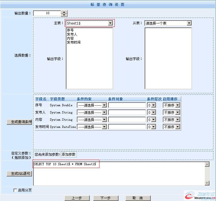 构造参数那步略过不谈,前次教程已经说过了,现在到了SQL构造的界面,实际上与前次教程一样,只要选择对应的工作表和输出字段,并点击“生成SQL语句”就可以自动生成了。