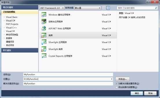 开启Visual Studio新建一个项目,模板选择类库,项目名和解决方案取名为MyFunction选择好保存的位置后点击确定按钮。此主题如下: